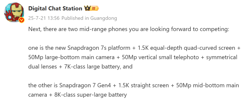 As can be seen above, DCS has shared key specifications of two upcoming smartphones. The first one appears to be a Redmi Note 15 Pro+, whereas the other seems to be the iQOO Z10.