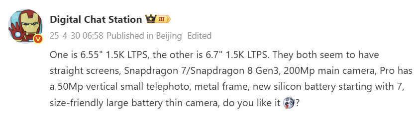 According to the tipster, the Honor 400 will be a smaller model equipped with a 6.55-inch OLED LTPS screen with a flat design. It is expected to feature a Snapdragon 7 series chip. While the new leak suggests that it will feature the Snapdragon 7 Gen 3, the same source has previously hinted at the inclusion of the upcoming Snapdragon 7 Gen 4.