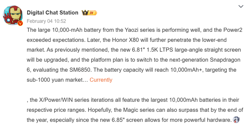 Earlier this week, DCS also revealed that the Honor X80 will be launching soon with a 10,000mAh battery and a new Snapdragon 6-series chip, which has the part number SM-6850. Additionally, the phone is said to feature a 6.81-inch OLED panel with rounder corners and a flat design. It will offer a 1.5K resolution and possibly a 120Hz refresh rate.