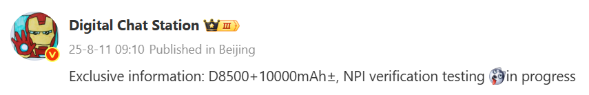 As can be seen above, DCS has revealed that Honor’s 10,000mAh battery phone will feature the Dimensity 8500 chipset. He added that the device has reached the NPI verification stage, which is a sub-stage within NPI where engineers run structured tests to ensure the design, components, and assembly meet quality and performance targets before moving to mass production.
