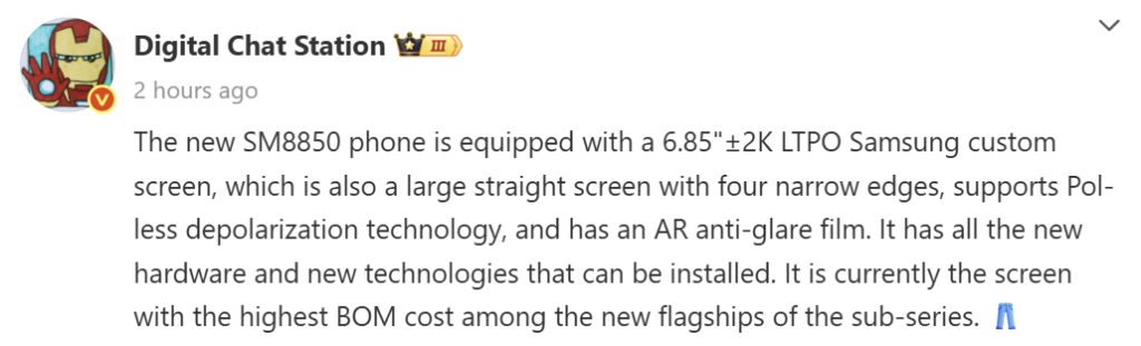 According to DCS, the upcoming iQOO 15 series will feature a high-end display with advanced specifications. It will be equipped with a 6.85-inch (approximately) 2K LTPO panel, which offers variable refresh rate support for power efficiency. The display is reportedly custom-made by Samsung and sports ultra-slim bezels on all four sides, creating a flat and immersive visual experience.