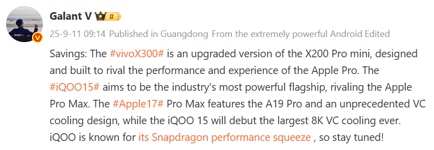 Apple has just launched the iPhone 17 series, with the iPhone 17 Pro Max powered by the new Apple A19 Pro chip, making it the company’s most powerful smartphone yet. Meanwhile, iQOO product manager Galant V took to Weibo to announce that the upcoming iQOO 15 is set to rival the iPhone 17 Pro Max as the industry’s most powerful phone. He revealed that the iQOO 15 will feature the largest 8K VC cooling system to date, designed to maximize performance from the upcoming Snapdragon 8 Elite Gen 5 chipset. Here’s a look at the rumored specifications of the iQOO 15.