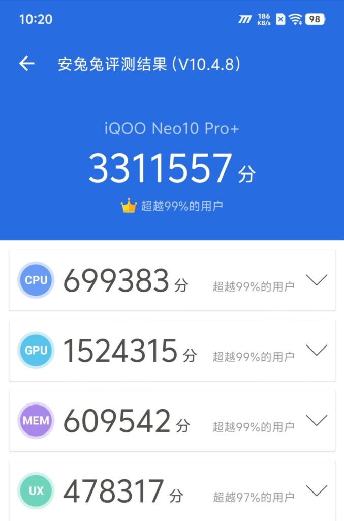 The listing reveals that the Neo 10 Pro+ scored 699,383 points in the CPU test, 1,524,315 points in the GPU test, 609,542 points in the memory test, and 478,317 points in the UX test. And that’s how it managed to score 3.3 million on AnTuTu.