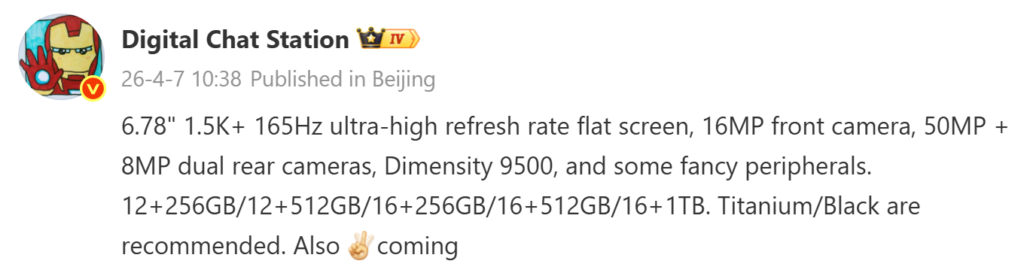 DCS’ leak also states that the Ace 6 Ultra will arrive in multiple configurations, including 12GB+256GB, 12GB+512GB, 16GB+256GB, 16GB+512GB, and a top-end 16GB+1TB variant. Color options are expected to include Titanium and Black.