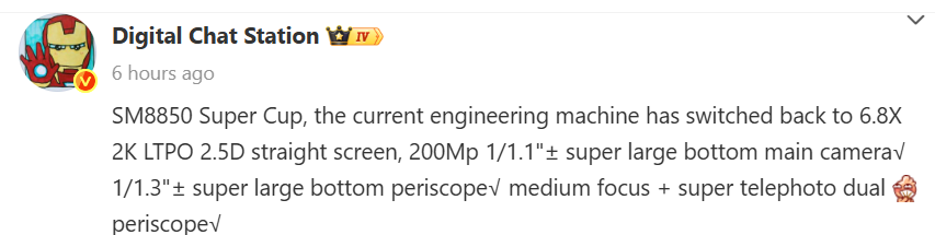 The camera setup will include a 200-megapixel main camera featuring a 1/1.1-inch large sensor. It will be joined by a mid-tier periscope telephoto camera and a flagship-class periscope telephoto camera. The latter is said to include a 1/1.3-inch large sensor.