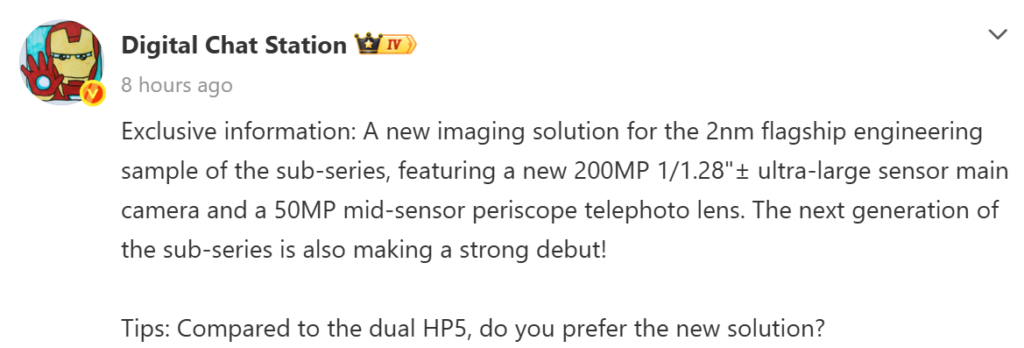 Alongside the main camera, the prototype is also said to include a 50-megapixel periscope telephoto lens with a mid-size sensor. The addition of a dedicated periscope camera suggests improved long-range zoom photography for the next-generation model. The tipster also hinted that this new configuration could replace the previously rumored dual Samsung HP5 camera system, which may have been tested earlier during development.