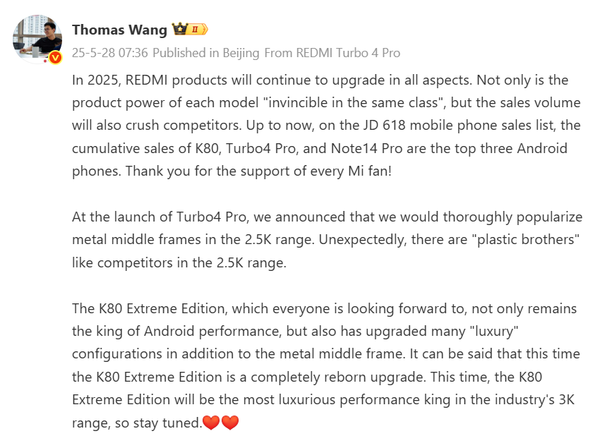 Wang Teng shared that the Redmi K80 Ultra will not only be performance-driven but also feature a luxurious build and advanced features. He confirmed that the device will have a metal middle frame and will have be slotted in the 3,000 Yuan ($415) price range in China.