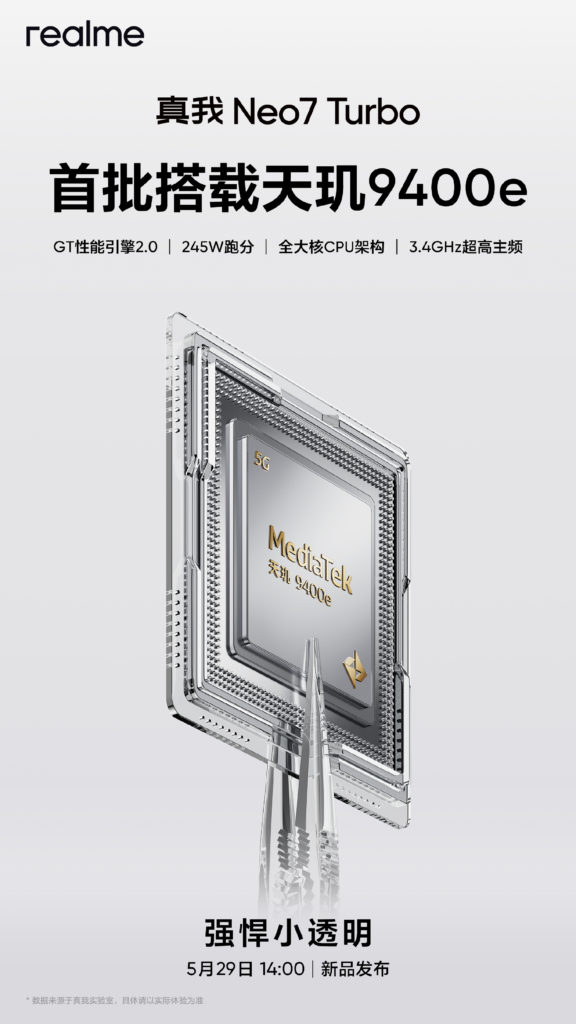 The Realme Neo 7 Turbo is officially confirmed to feature the Dimensity 9400e chipset. It is the same chip that powers the OnePlus Ace 5 Racing Edition, which is scheduled to launched on May 26 in China.
