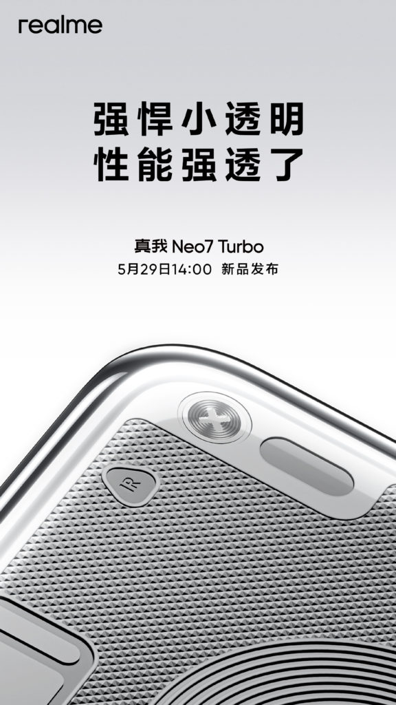 Realme has been teasing the arrival of a new Turbo-branded phone under its Neo series in China. Today, the brand officially confirmed that it will launch the Neo 7 Turbo on May 29 in its home market. The official teasers also reveal the chipset and offer a glimpse at the phone’s design.